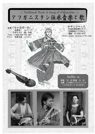 ダルブッカ、トンバクなどを叩きます.アフガニスタンの歌を歌います.アフガン伝統音楽デュオ「ちゃるぱーさ」、民族フレンチプログレ?ユニット「バカボンヌ」、オリジナル弦楽プログレトリオ「さとりやき」、等に参加.