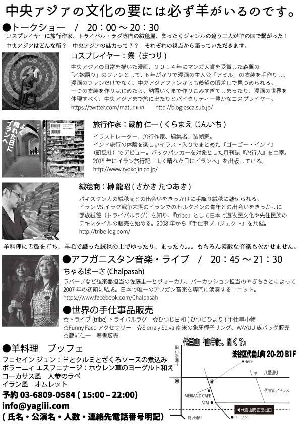 祭さんのトークや、羊料理、そしてアフガン音楽など、盛り沢山のイベントです。
